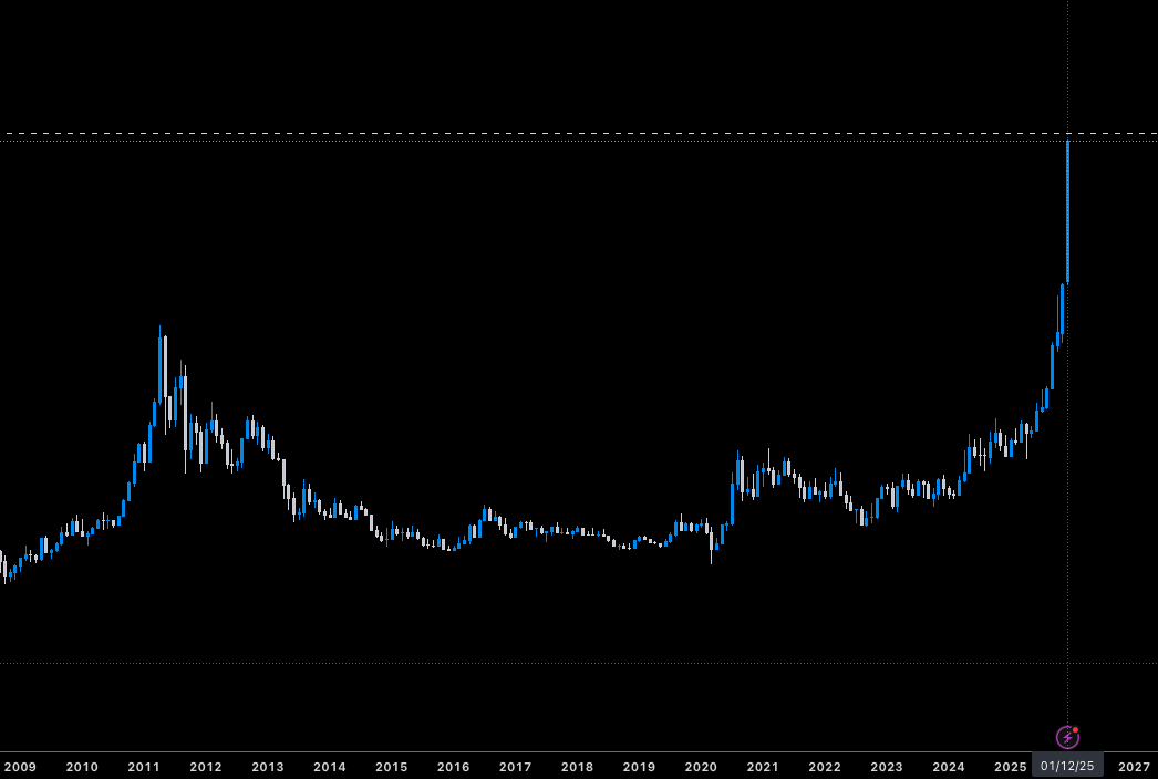 On October 16, 2025, the price officially closed above $53, confirming the technical breakout from the 1980 highs. Analysts note that physical shortages in London markets forced a decoupling between the “paper” price and the physical price, forcing short sellers to capitulate.