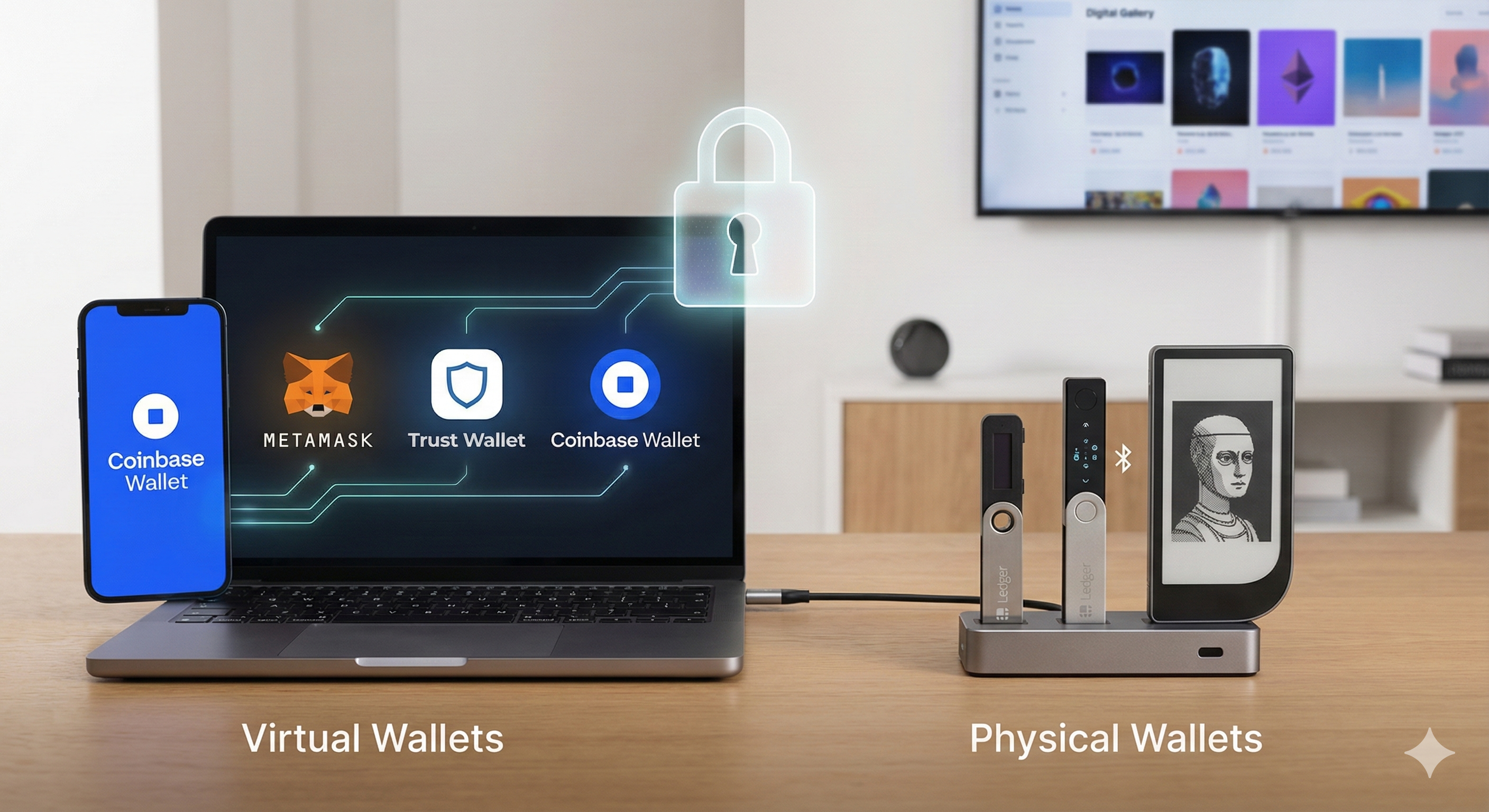 En résumé, les portefeuilles virtuels sont accessibles via un ordinateur ou un smartphone, alors que les portefeuilles physiques stockent vos clés privées sur un dispositif physique. Les versions virtuelles sont pratiques mais moins sécurisées, tandis que les portefeuilles physiques sont plus sécurisés, mais un peu plus difficiles à utiliser.